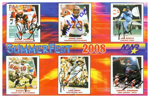 Darryl Dawkins signed card; Obtained in person Tuesday, June 27th, 2006 Norfolk NAS. Mr. Dawkins is a former professional basketball player, most noted for his days with the Philadelphia 76ers and New Jersey Nets, although he also played briefly for the Detroit Pistons and Utah Jazz late in his career. He was known as "Chocolate Thunder" for his board-breaking dunks...which he would name. The bottom two items (autographed page and photo, are from June 24th, 2008 (same place). He was very funny and nice. |