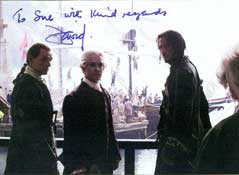 David Schofield signed photos. Obtained through the mail. Mr. Schofield was Mr. Mercer in Pirates of the Caribbean I, II and III.